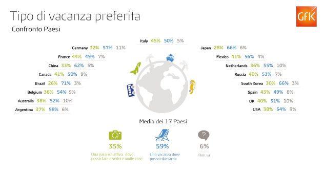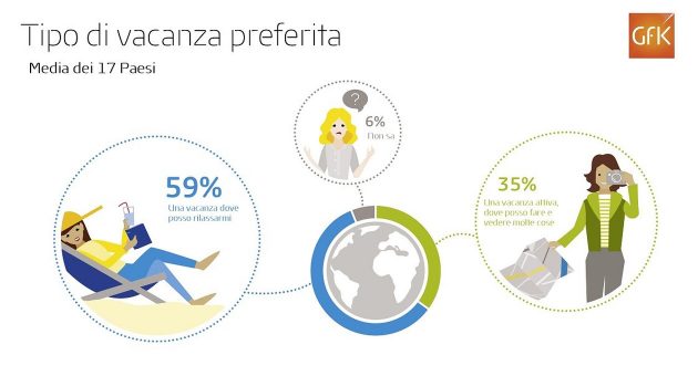 Secondo un’indagine internazionale realizzata da GfK, il 59% delle persone preferisce fare una vacanza rilassante, mentre il 35% è per le vacanze attive.